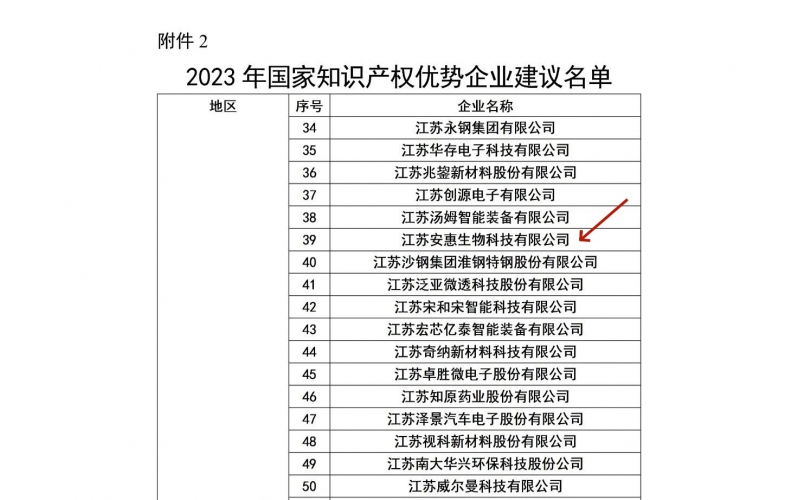 2023年11月,國家知識產(chǎn)權局公布了2023年度國家知識產(chǎn)權優(yōu)勢企業(yè)名單,江蘇安惠生物科技有限公司榜上有名。